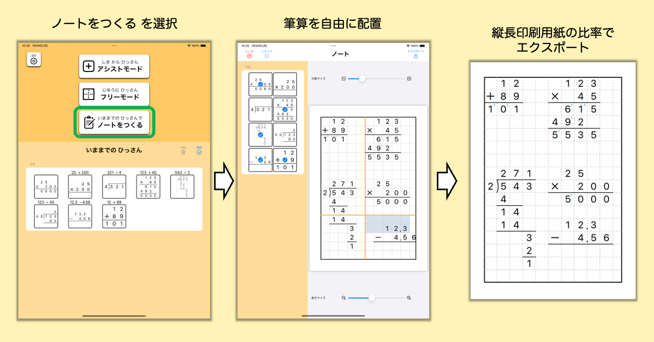 保存された筆算は、一枚のノートにまとめ、PDFファイルにエクスポートすることができます。